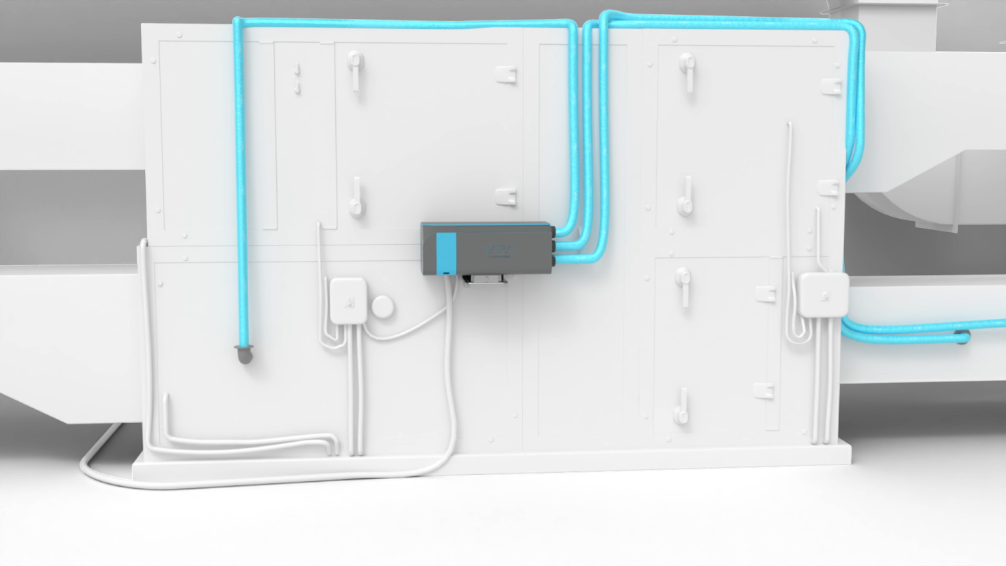 The device must be placed near the Air Handling Unit (AHU). One cable carrying the disinfectant liquid is inserted into the AHU, and one or two additional cables go into the ducts depending on if the duct splits close to the AHU. With the purchase, you receive a detailed manual on how to install Lara Systems.